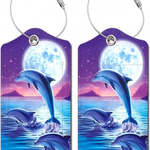 2 Pack Luggage Tag for Suitcase, Cute Unique Leather Bag Tags Identifiers Privacy Cover ID Label with Durable Steel Loop for Women Men Kids Girls Travel,DolphinB