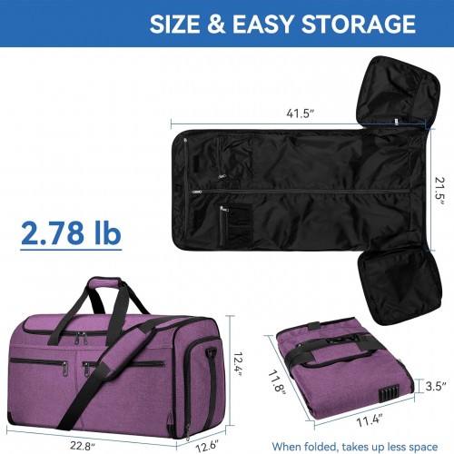 Large Garment Bag for Travel, Bukere Convertible Suit Travel Garment Duffel Bag for Women Business, Shoe Compartment, Detachable Shoulder Strap, 2 in 1 Hanging Suitcase Suit Travel Bags, Purple