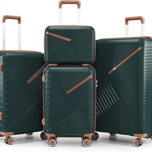Campfun Luggage Sets 4 Piece, Expandable Carry On Luggage Set Hardshell PP, Suitcase Set with Double Spinner Wheels, Checked Durable Lightweight with TSA Lock, 14/20/24/28in, Dark Green Brown(B)