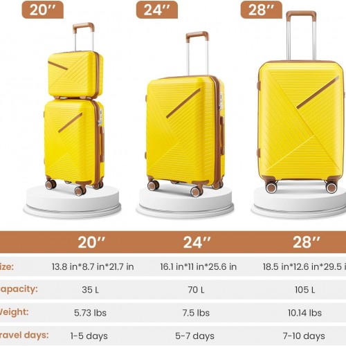 Campfun Luggage Sets 4 Piece, Expandable Carry On Luggage Set Hardshell PP, Suitcase Set with Double Spinner Wheels, Checked Durable Lightweight with TSA Lock, 14/20/24/28in, Yellow Brown(B)