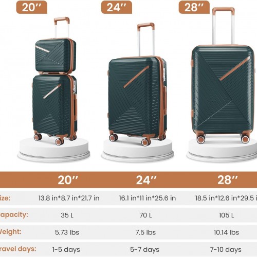 Campfun Luggage Sets 4 Piece, Expandable Carry On Luggage Set Hardshell PP, Suitcase Set with Double Spinner Wheels, Checked Durable Lightweight with TSA Lock, 14/20/24/28in, Dark Green Brown(B)