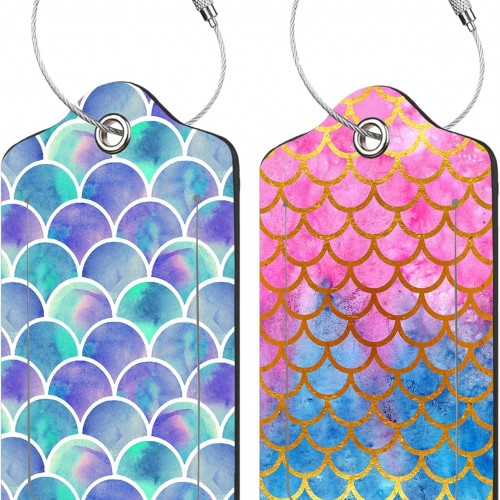 2 Pack Mermaid Scales Luggage Tags for Suitcases,Watercolor Fish Scales Leather Baggage Suitcases Tag Name ID Label Privacy Cover Travel Bag Tags for Women Men Boys Girls