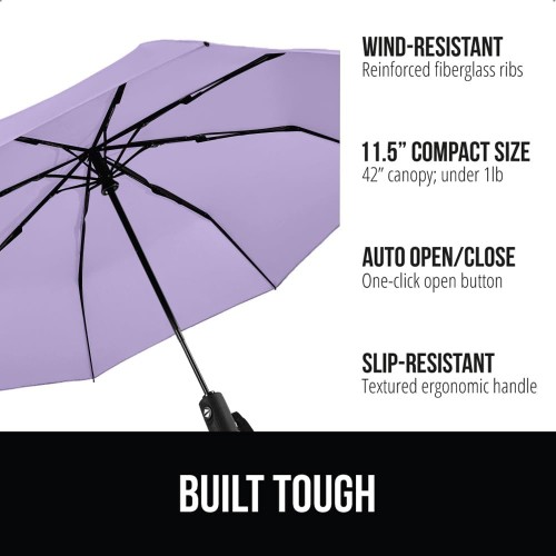 GORILLA GRIP Strong Stick Umbrella for Rain, Compact Travel One-Click Automatic Open Close, Lightweight, Portable, US Designed Reinforced Fiberglass Ribs, Wind Resistant, Easy Collapse, Purple