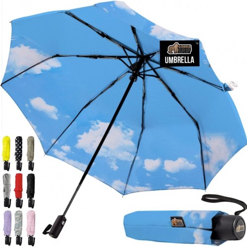 GORILLA GRIP Strong Stick Umbrella for Rain, Compact Travel One-Click Automatic Open Close, Lightweight, Portable, US Designed Reinforced Fiberglass Ribs, Wind Resistant, Easy Collapse, Sky Blue