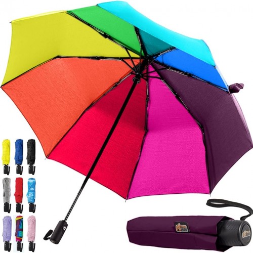 GORILLA GRIP Strong Stick Umbrella for Rain, Compact Travel One-Click Automatic Open Close, Lightweight, Portable, US Designed Reinforced Fiberglass Ribs, Wind Resistant, Easy Collapse, Rainbow