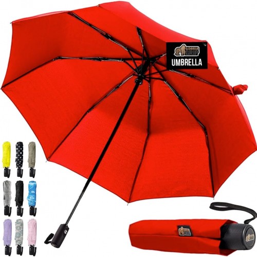 GORILLA GRIP Strong Stick Umbrella for Rain, Compact Travel One-Click Automatic Open Close, Lightweight, Portable, US Designed Reinforced Fiberglass Ribs, Wind Resistant, Easy Collapse, Red