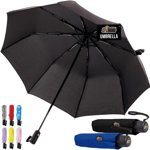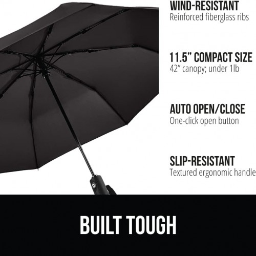 GORILLA GRIP Strong Stick Umbrella for Rain, Compact Travel One-Click Automatic Open Close, Lightweight Portable US Designed Reinforced Fiberglass Ribs, Wind Resistant Easy Collapse Black Gray 2 Pack