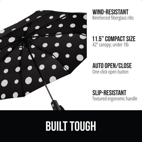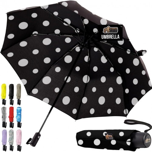 GORILLA GRIP Strong Stick Umbrella for Rain, Compact Travel One-Click Automatic Open Close, Lightweight, Portable, US Designed Reinforced Fiberglass Ribs, Wind Resistant, Easy Collapse, Polka Dots