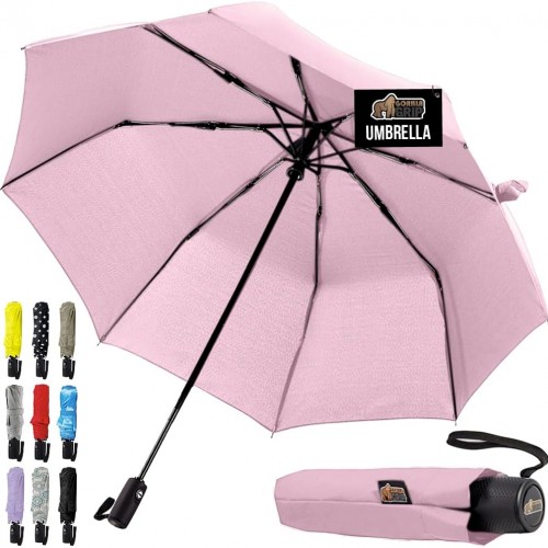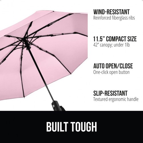 GORILLA GRIP Strong Stick Umbrella for Rain, Compact Travel One-Click Automatic Open Close, Lightweight, Portable, US Designed Reinforced Fiberglass Ribs, Wind Resistant, Easy Collapse, Pink
