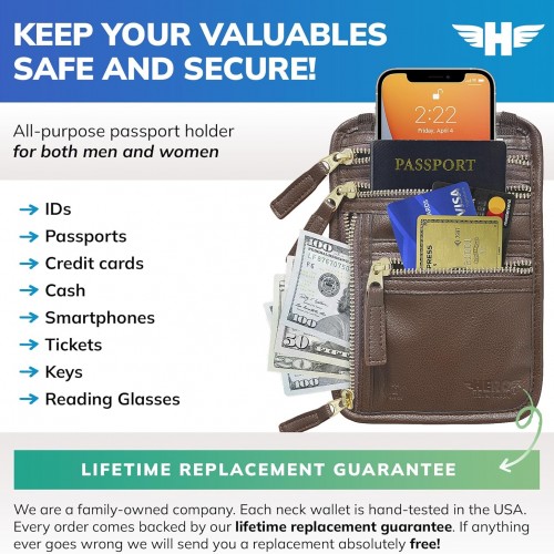 HERO Neck Wallet, RFID Blocking Passport Holder, Vegan Leather Travel Pouch (Brown)