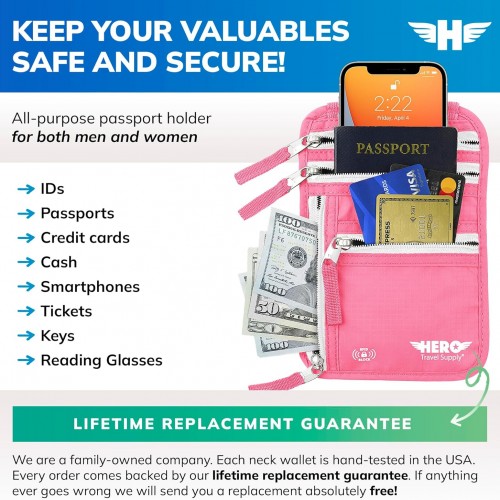 Hero Travel Supply Neck Wallet, RFID Blocking Passport Holder, Easy to Conceal Pouch (Hot Pink)