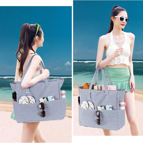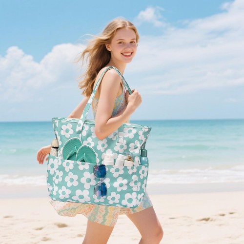 LEDAOU Large Beach Tote Bag Women Waterproof Sandproof Zipper Beach Tote Bag for Pool Gym Grocery Travel with Wet Pocket