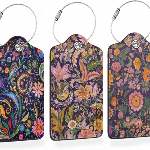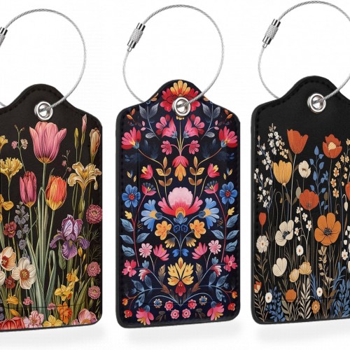Colorful Boho Flowers 3 PCS Luggage Tags, Vintage Floral Leather Suitcase Tags with Privacy Cover Name Address Labels and Durable Steel Loop for Men/Women Travel Bag Suitcases