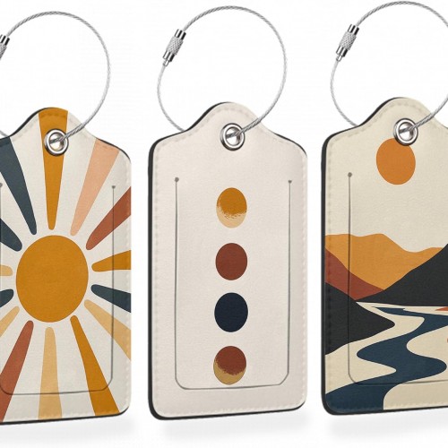 Colorful Abstract Mountain 3 Pack PU Leahter Luggage Tag with Stainless Steel Loop, Bold Golden Sun Crescent Moon Travel Suitcase Labels with Privacy Cover ID Label Quickly Spot for Bags