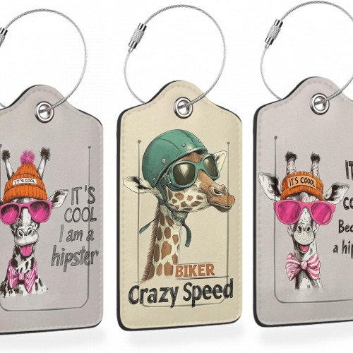 Funny Hipster Giraffe 3 Pack PU Leahter Luggage Tag with Stainless Steel Loop, Cool Cartoon Giraffe Travel Suitcase Labels with Privacy Cover ID Label Quickly Spot for Bags
