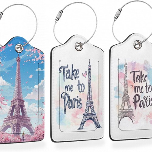 Eiffel Tower Sakura 3 Pack Luggage Tags for Suitcases, Take Me to Paris PU Leather Luggage Tag for Travel, Bag Tags with Privacy Name ID Card and Steel Loop for Women Men