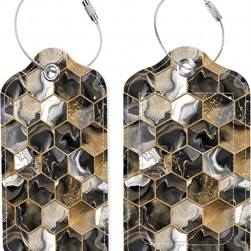 Gold Ink Hexagon Texture Luggage Tags 2PCS PU Leather Suitcases Tag with Stainless Steel Loop and Privacy Name Address Cover Label Card for Women Men Travel