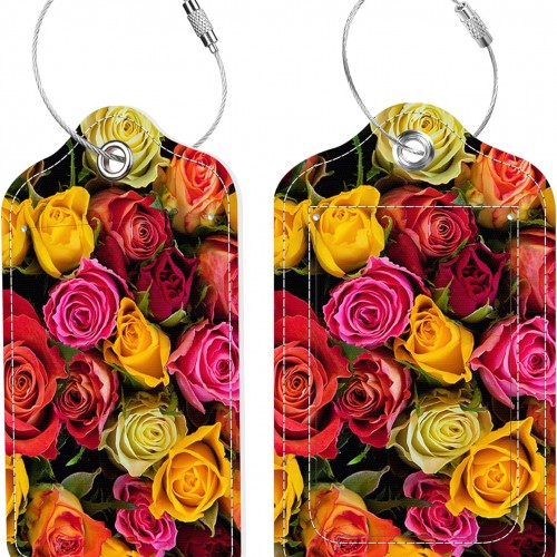Colorful Roses Luggage Tags 2PCS PU Leather Suitcases Tag with Stainless Steel Loop and Privacy Name Address Cover Label Card for Women Men Travel
