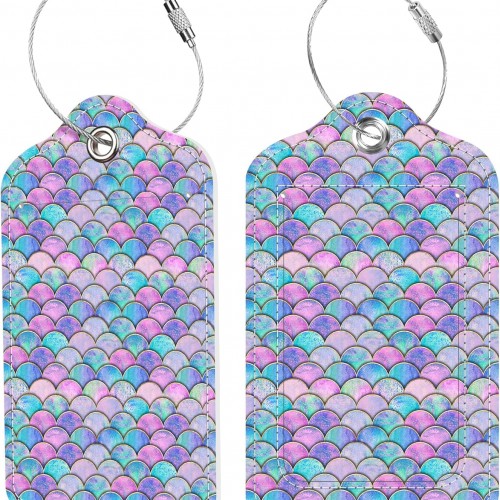 2 Pack Luggage Tags for Suitcase Watercolor Mermaid Fish Scale Wave Leather Stainless Steel Loop Label Tags for Women Men Travel Bag Suitcase with Privacy Cover Name ID Card