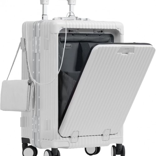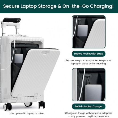Nobl Travel Carry On Luggage, Noble Zipperless Aluminum Frame PC Hard Shell Suitcase, 22.5x15x9.5 Airline Approved, 360° Spinner Wheels, TSA Locks, USB Charging Port, Cup & Phone Holder – White