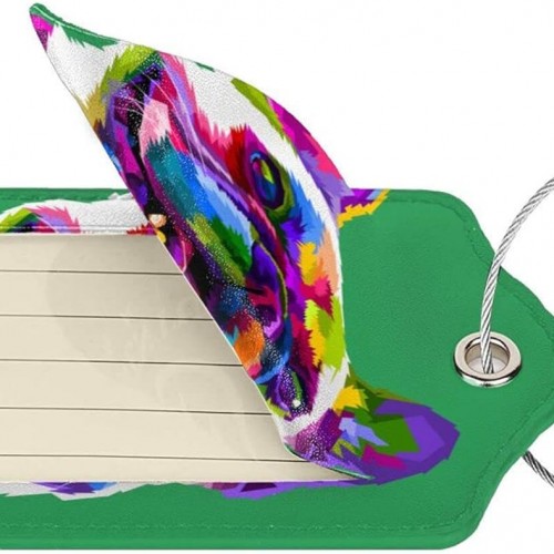 Cute French Bull Dog Luggage Tags for Boys Girls Adults, Set of 2 Stylish Art Colors Animal on Green Background Leather Stainless Steel Loop Label Tag for Travel Bag Suitcase