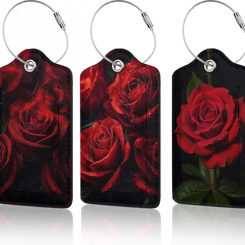 3 Pack Red Rose Luggage Tags for Suitcases, Cute Leather Name Tag with Privacy Cover with Stainless Steel Loops, Travel ID Bag Tags for Women Men