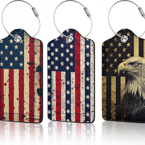 3 Pack PU Retro American Flag Leahter Luggage Tag with Stainless Steel Loop,Travel Suitcase Labels with Privacy Cover ID Label Quickly Spot for Bags