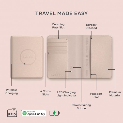 Satechi Passport Holder for Travel with Find My, Passport Cover with 4 Card Holder, Wireless Charging, and RFID protection – Travel Essential Vegan Leather Passport – Desert Rose