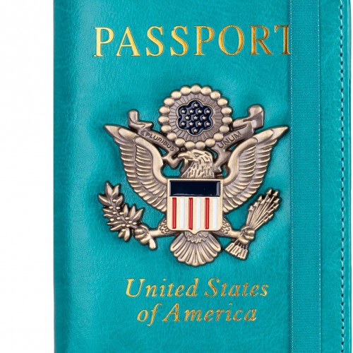TOURSUIT RFID Blocking Passport Holder for Women Men, Leather Passport Travel Wallet with Metal 3D Metal Badge, Travel Document Holder Cover Accessories (Light Blue)