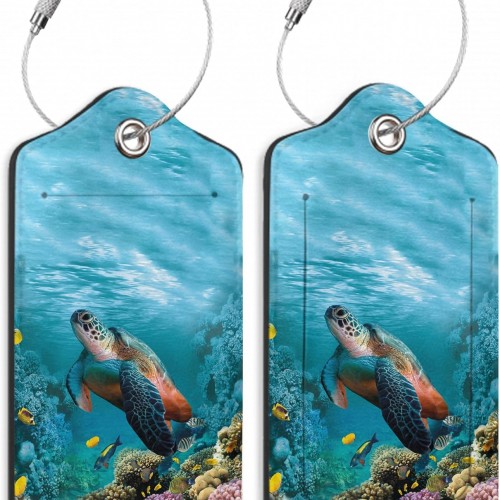 Set of 2 Luggage Tags for Suitcases, Leather Turtle Fish and Coral Baggage Tags with Stainless Steel Loop, Privacy Name ID Card Cover Kawaii Travel Labels for Women Men Kids Girls