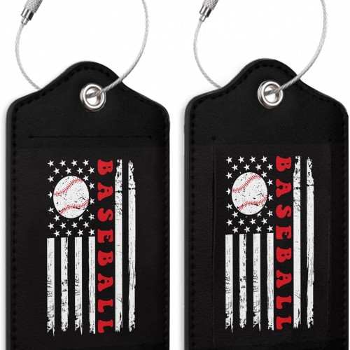 2 Pack Leather Luggage Tag for Suitcase Vintage Baseball American Flag Unique Travel Tags with Privacy Cover ID Label & Stainless Steel Loop for Men and Women Baggage