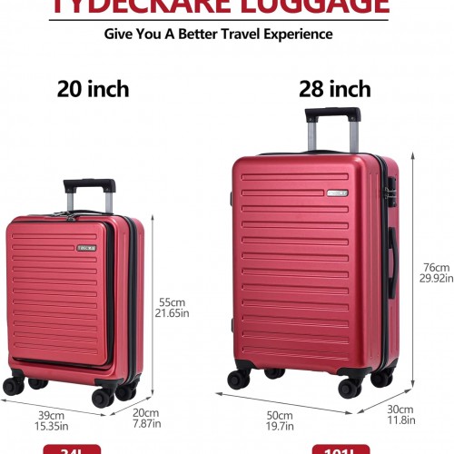 TydeCkare 2pcs 20/28″ Luggage Set Lightweight HardShell, Only 20 Inch Carry On 21.65 * 15.35 * 7.87″ Cabin Suitcase with Front Pocket, 28 Inch 19.68 * 11.81 * 29.92″ Checked Luggage, Wine Red