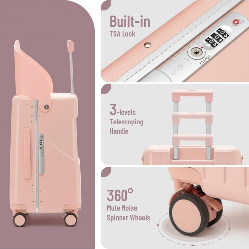 22 Inch TSA Lock Luggage with Seat for Adults and Kids,Check in Lockable Spinner Wheels Suitcase with Seat Belt and Cover (TSA Luggage with Seat Pink)