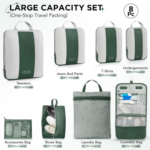8 Set Compression Packing Cubes for Travel Essentials,Compressible Expandable Packing Cubes for Suitcase,OlarHike Luggage Organizer Bags for Travel,Handy Helper for Organizing Clothes(Dark Green)