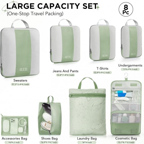 8 Set Compression Packing Cubes for Travel Essentials,Compressible Expandable Packing Cubes for Suitcase,OlarHike Luggage Organizer Bags for Travel,Handy Helper for Organizing Clothes(Matcha Green)