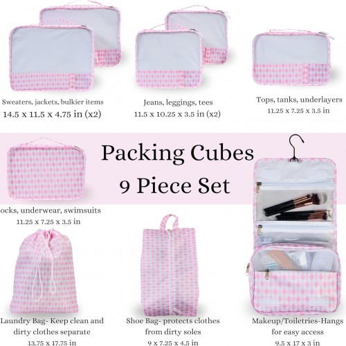 9 Set Packing Cubes – Suitcase Organizer, Cute Packing Cubes, Travel Bags Organizer for Luggage with Hanging Toiletry and Shoe Bag, Travel Essentials for Women, Men and Kids -Pink