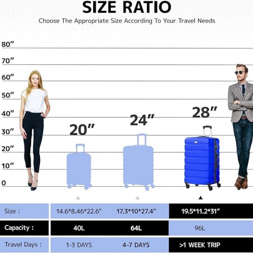 - [Checked-Large 28 Inch] The 28-inch suitcase meets the functions of boarding, travel, and daily storage. Size: 19.5*11.2*31 inches. Capacity: 96L.