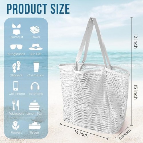 - 🏖️Large Mesh Beach Bag: Mesh beach tote easuring 15.15 x 14.17 x 6.69 inches,sturdy enough to bear 30+lbs. This beach bag offers ample space for all your family’s beach or pool essentials. You can comfortably carry towels, swimwear, flip flops, water bottles, sunglasses, sunblock, toys, and more.