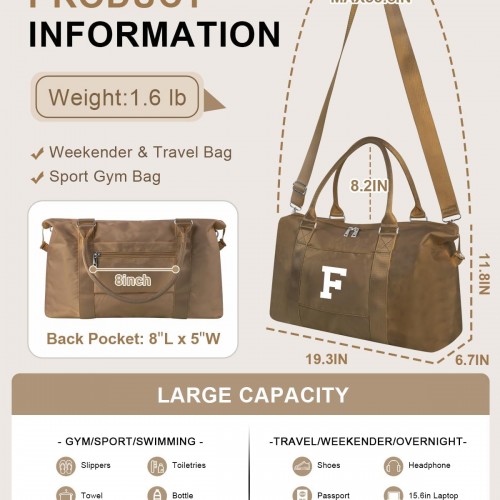 Birthday Graduation Gifts for Daughter,Initial Travel Duffel Bag Sports Gym Bag for Girls Teen Kids Birthday Gifts,Personalized Weekender Bag Carry On Tote Bags Cute Overnight Bag for Women(Brown, F)