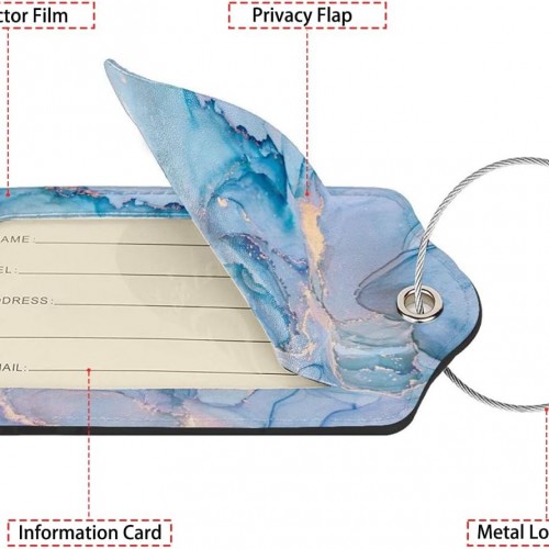 Blue Gold Marble 2 Pack Luggage Tag for Suitcase, Cute Unique Leather Bag Tags Identifiers Privacy Cover ID Label with Steel Loop for Women Men Kids Girls Travel