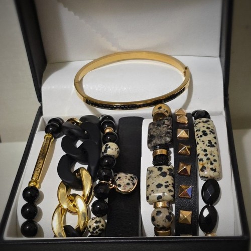 Your arm will definitely attract some attention with this set ! This set is made with grade AAA dalmatian jasper and onyx beads of different shapes and sizes. Our onyx is smooth and shiny , how ever one bracelets does have matte finished onyx. You will find onyx throughout most of our designs for it is our designer one of many favorite stone. This set also comes with an bamboo acrylic link bracelet, L.Signature Bracelet, stainless steel bangle with black crystals, and a leather buckle bracelet.