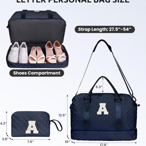 Gifts for Friends – Initial Duffle with Shoe Compartment, Personalized Weekender, Monogram Overnight, Travel Bag with Makeup Bag, Birthday Gift for Daughter/Sister (Letter I)