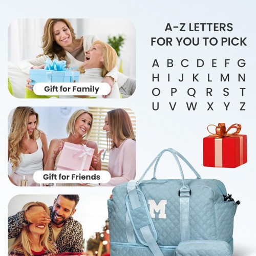 Gifts for Friends – Initial Personalized Weekender Duffle Bag with Shoe Compartment and Travel Makeup Bag for Daughter or Sister (Letter I)