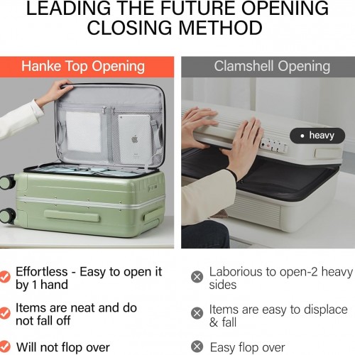 - 【CREATIVE FRONT OPENING】 Hanke trunk style carry on luggage,Leading the future opening and closing method which is effortless to open or close the suitcase, not only is it easy to load, but it also saves space. This design solves the problem that traditional luggage separated 2 compartments of heavy load then it’s difficult to open and close. Importantly, it also avoid the displacement of items.