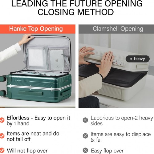 - 【CREATIVE FRONT OPENING】This trunk luggage with spinner wheels Leading the future opening and closing method which is effortless to open or close the suitcase, not only is it easy to load, but it also saves space. This design solves the problem that traditional luggage separated 2 compartments of heavy load then it’s difficult to open and close. Importantly, it also avoid the displacement of items.