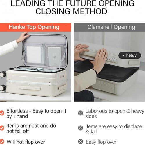 - 【CREATIVE FRONT OPENING】This trunk luggage with spinner wheels Leading the future opening and closing method which is effortless to open or close the suitcase, not only is it easy to load, but it also saves space. This design solves the problem that traditional luggage separated 2 compartments of heavy load then it’s difficult to open and close. Importantly, it also avoid the displacement of items.