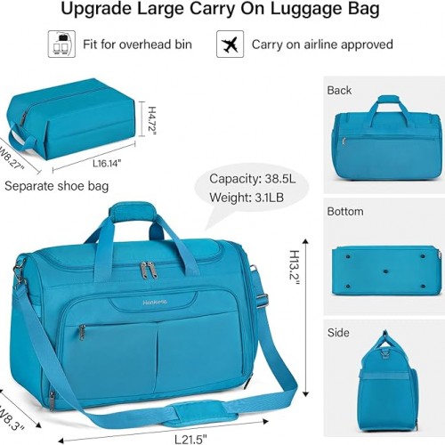 Hanke Carry On luggage Bags for Travel, Large Foldable Duffle Bag for Travel, Softside Lightweight Travel Bag Carry On Bags for Airplanes Women, Travel Tote Bags for Women Men.(Caribbean Blue)