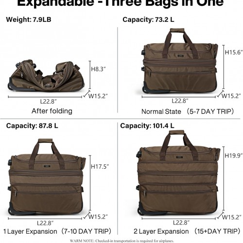 - 【Expandable and Foldable】Three Bags in One: After folding is L22.8″ * W15.2″ * H8.3″, weight 7.9LB. Normal state is L22.8″ * W15.2″ * H15.6″, 73.2L; 1 layer expansion is L22.8″ * W15.2″ * H17.5″, 87.8L; 2 layer expansion is L22.8″ * W15.2″ * H19.9″, 101.4L; This is a rolling duffel bag that is required to check in luggage. (Non carry-on luggage)