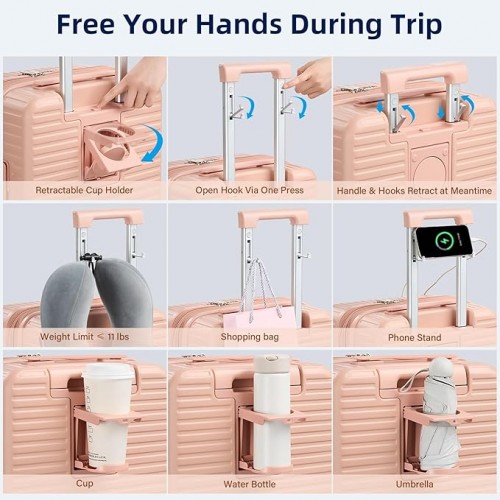 - 【Cup / Phone Holders & 2 Charging Ports】2 piece luggage sets are engineered with a universal cup holder for most water bottles, coffee mugs and tumblers. Retractable dual hooks securely hold various persoanl items like phone, iPad, U-shape throw pillow, handbag, etc (up to 11 lbs). Built-in charging ports allow on-the-go power access for Type-C / USB devices (portable power bank not included). Multifuncational pink luggage set to set your hands free during layover at airport / train station.