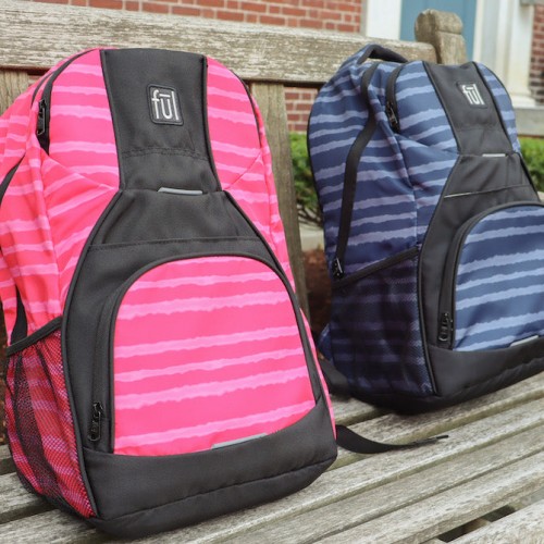 In a colorful striped light blue & dark navy blue print, this multi-functional backpack is quintessential for traveling, work, weekend getaway, or running errands around town.